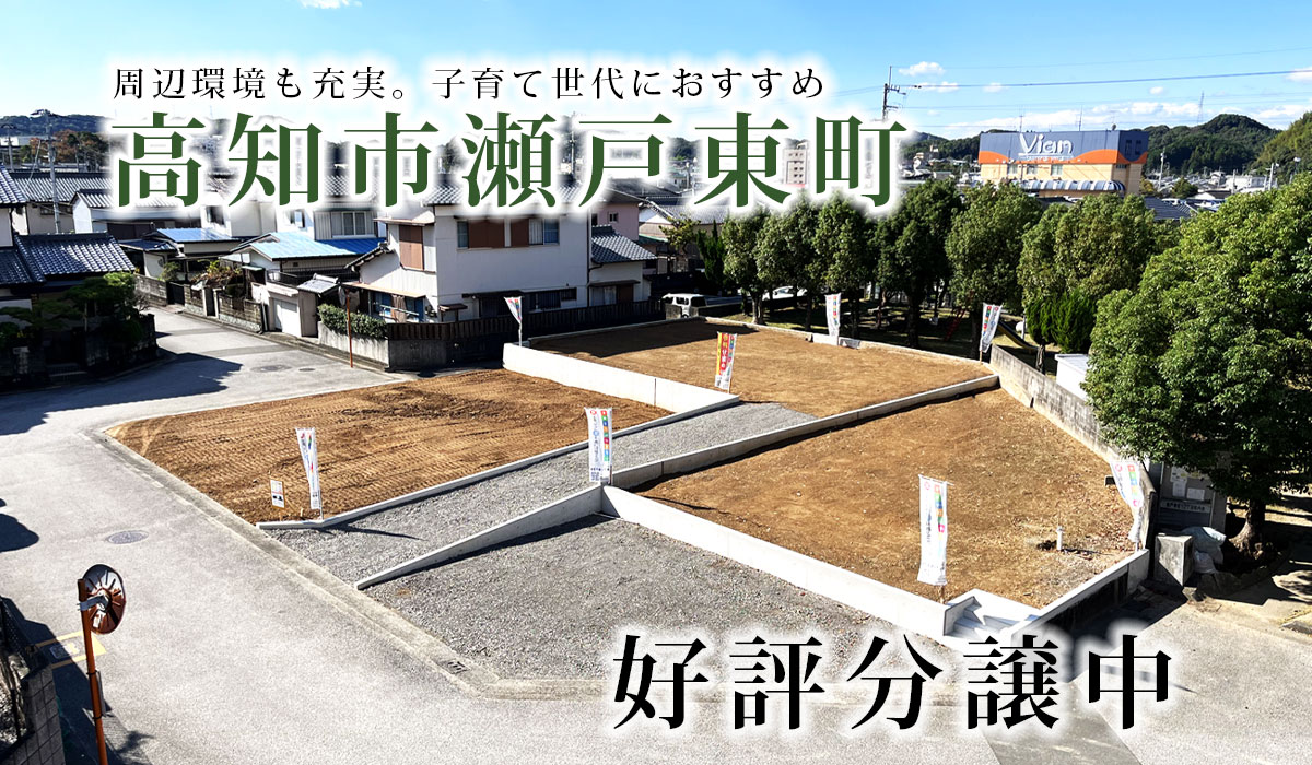 高知市瀬戸東町の高台に公園隣接の分譲地。小学校・スーパー・銀行など近く通学に生活に便利な施設多数あり。公園に囲まれた緑豊かな住環境、日当たり重視の区画計画で全区画ゆとりの50坪以上で庭も駐車場も広く取れます!