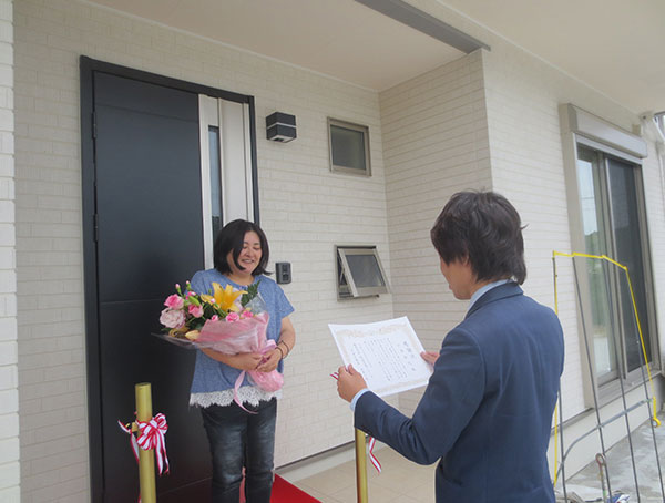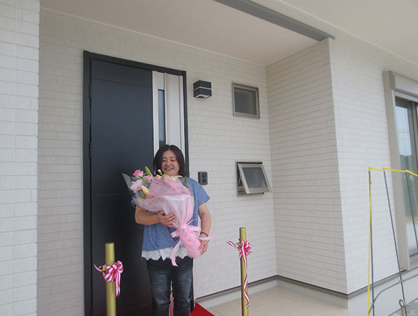 ついに念願の新居が完成しました!!引越しも終わり、新しい家での新しい生活がはじまりました。今日は住宅設備や建具などの説明と引渡のセレモニーをしていただき、少しはずかしかったですが幸せな気分になりました。高知市からは遠方になりますが、担当の首藤さんから「メンテナンスやわからないことなど御用があればいつでも声をかけてください」と言っていただいたので、住み始めてからも安心できそうです。これからもよろしくお願いします。