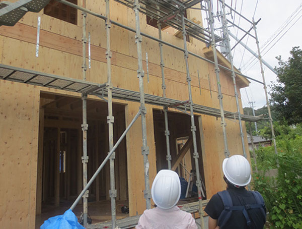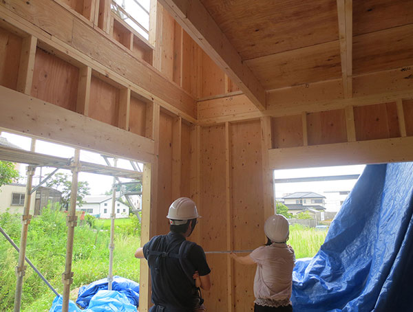 前3日目の現場ご訪問です。ホームページのお施主様専用ページで建前の様子を見ていましたが、実際に現場を見てみると建物が大きく感じられ、迫力がありました。基礎工事の時点ではイメージしづらかった間取りも、家の中に入って見てみると具体的な形になっていて完成が楽しみで実感がわきました。電気配線の打ち合わせも終わり、配線工事が終わると断熱材が吹き付けられるそうなので、次回はそのタイミングで案内してもらいたいと思っています。