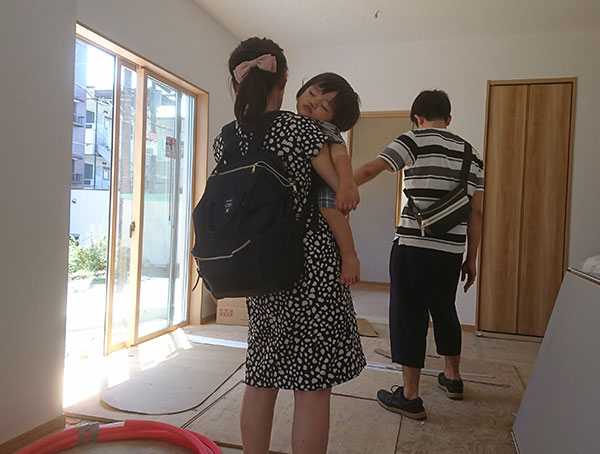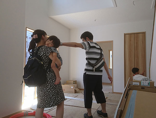 今日で4回目の建築現場の案内をして頂きました。今月中旬頃の引き渡しとなっていますので、引っ越しの準備や新居で使う調度品を買ったり忙しい毎日ですが、今は楽しみがいっぱいで、何の苦も感じません。今日はカーテンのイメージを考えたいと思って見に来ました。自分達で注文したエコキュートも綺麗に設置されてて良かったです。この新居での生活を家族で楽しみにしています。