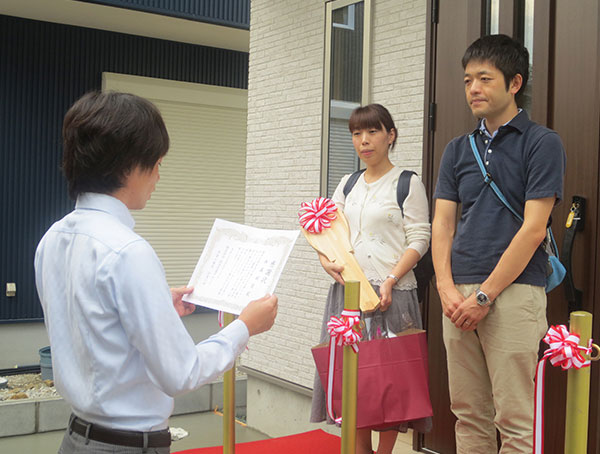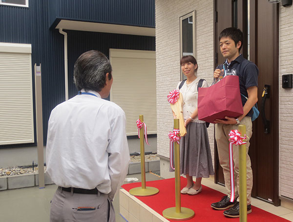 結婚してからマイホームを持つことが家族の夢でした。今年1月にふいに伺った完成見学会で、暮らす上で最も大事な安全面の「耐震等級3、省令準耐火でも安いです。」という説明を聞いてすぐに不安は無くなりました。キッチンから家族の様子が見渡せる間取りや、ニッチ、仕切り板などの注文にも柔軟に対応していただきましたまた、毎回の打ち合わせの時、子供達に優しく接してくださり、世話をしていただき、スタッフの皆様に感謝しています。当初、御社の商品は規格されたものだと思っていましたが、外から内まで全て自分たちで選ぶことができ、世界で一つだけしかないマイホームを作っていただきました。今後とも末長いお付き合いをよろしくお願いします。