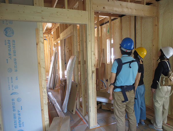 本日は、夢プラザでの仕様打ち合わせの前に、自宅の建築現場を案内していただきました。現場に行くと、丁度ユニットバスの工事をしているところで、工事の様子が見られて楽しかったです。外壁工事も終わっていました。徐々に自宅が出来上がっていく様を説明していただきながら現場で見られるのは嬉しいです。