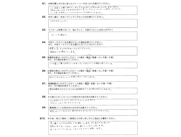 2〜3年前から家を買いたいと考えていましたが、なかなかいい土地が見つかりませんでした。雑誌で平安アーキテクトさんを見て相談に行くと、希望に合った土地を紹介してくれ、トントン拍子で話が進んでいきました思い通りの素敵な家ができて満足しています。まだ自分たちの家という実感が無いですが、大切に暮らしていきたいと思います。ありがとうございました。これからもよろしくお願いします。