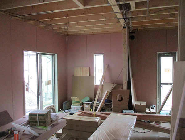 高知市八反町の弊社造成地でご建築いただいておりますO様ご家族の現場案内を致しました。『夢プラザ』にて仕様のお打合せ終了後の日中の暑い頃でございましたが、担当の芝大工と棚板やカウンターの位置やサイズについて現場で実物をもって、『この大きさの物がここに付きます。』などお打合せさせて頂きました。室内の壁もほとんど仕上がっており、大工仕事も後2週間程で終わるとの事。O様はLDKにて『ここに立つと開放感あるね。』と実際のお家を体感されていました。10月には、完成お引渡しの予定です。ステキな住まいが出来上がるのが楽しみです。これからもステキなマイホームが出来上がっていく様子を、楽しんでご覧頂ければ嬉しいかぎりです。