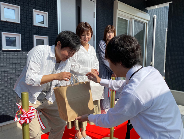 土地探しから当社でお手伝いをさせていただき、Y様のご希望の土地がございましたので建築のご依頼を承りました。玄関ホールからご趣味である熱帯魚の水槽がお出迎えしてくれ幻想的な照明がこだわりのY様邸。LDKには吹き抜けも南側にあり、開放的な空間が広がっております。お住まいになられて、「非常に快適です!これからお家に関して分からない事や、トラブルなどあればご連絡させていただきます。「本日はたくさんの方にセレモニーにお越しいただきありがとうございます。」というお言葉もいただき、社員一同嬉しく感じております。お引渡しはさせていただきましたが、これから当社との末永いお付き合いのスタートとなります。本日はおめでとうございました。