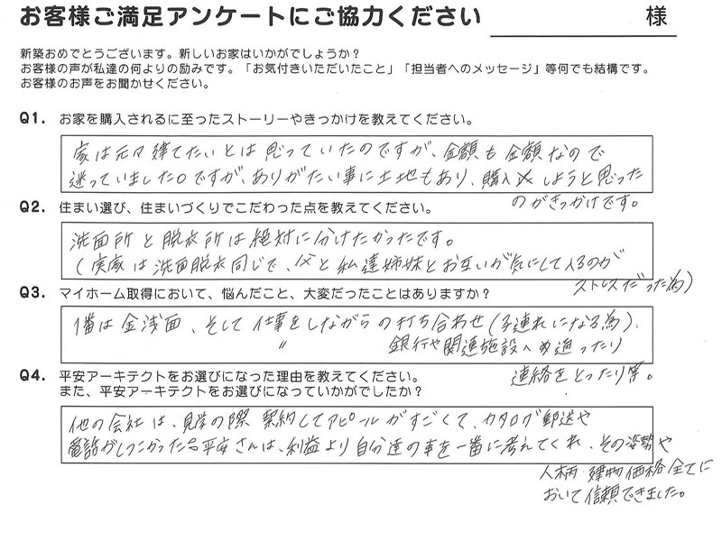 A.他の会社は見学の際、契約してアピールがすごくて、カタログ郵送や電話がしつこかった。平安さんは、利益より自分たちのことを一番に考えてくれ、その姿勢や人柄、建物価格全てにおいて信頼できました。