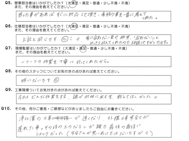 A.浄化槽の工事が遅くなり、外構工事等全てが遅れた事。その後土ならしが雑で最後の最後にショックだった。(平安さんが悪いわけではないですが)
