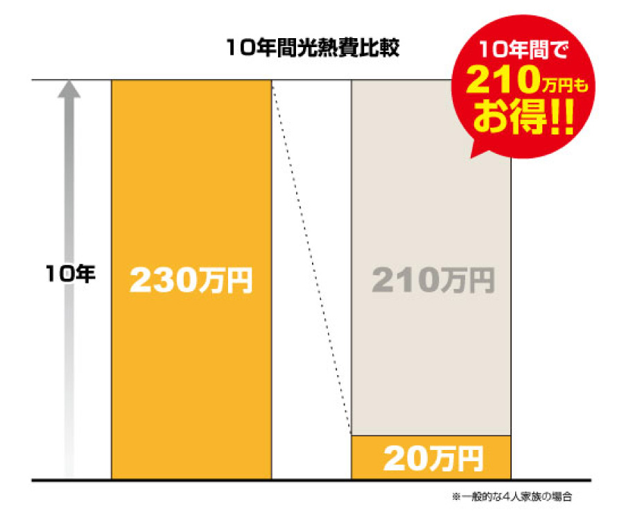 一般的な4人家族の光熱費は、年間で約23万円。これを「太陽光発電システム」+「オール電化」の住宅で試算すると、光熱費が約14万円に節約ができ、約12万円分を発電するから、差引約2万円のみの支払いになります。長期間で見ると、一般住宅と「太陽光発電システム」+「オール電化」の住宅との光熱費の格差はさらに広がります。10年間で比較してみると、一般住宅では230万円もの光熱費がかかることに対し、「太陽光発電システム」+「オール電化」の住宅では20万円とグッと抑えられます。