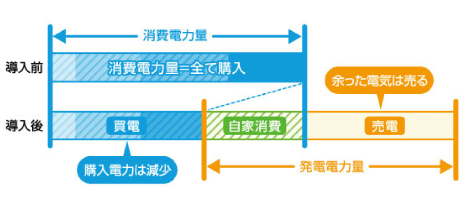 太陽光で発電した電気を自家消費することで、電力会社からの購入電力を削減できます。また、余った電気は電力会社に売ることも可能です!