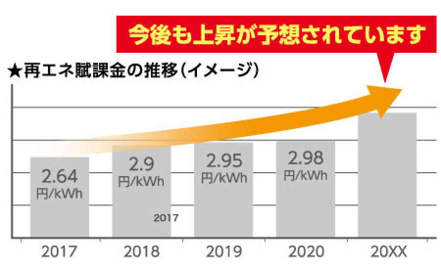 ※省エネ賊課金とは、再生可能エネルギーで発電した電気を電力会社が買取るためにかかった費用を毎月の電気料金の一部として、利用者が支払っています。そのお金を「再生可能エネルギー発電促進賊課金」。省略して「再エネ賊課金」と言います。