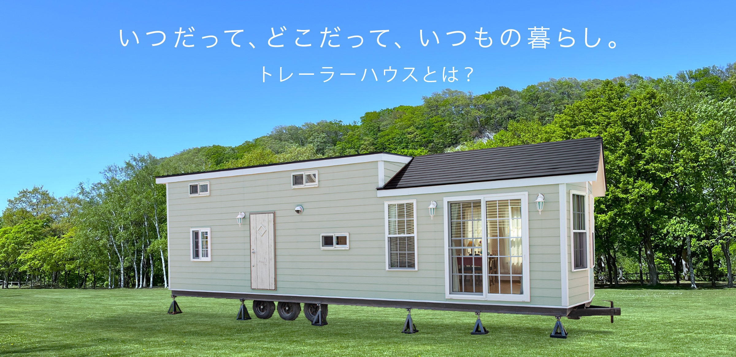 トレーラーハウスは、タイヤのついたシャーシーというフレームにの乗った構造物で、自動車で牽引できる「移動することが可能な家」です。自走できるキャンピングカーとは違い、基本的にはどこでも設置することができます。移動な可能な状態を維持していれば「車両扱い」のため、建物の規制などを受けることがなく、様々メリットを生み出します。また、一般住宅と同じ「お風呂・キッチン・トイレ」などの生活に必要な設備を備えております。住居の利用だけでなく、店舗や事務所、飲食店や休憩所などさまざまな用途で活用することができます。
